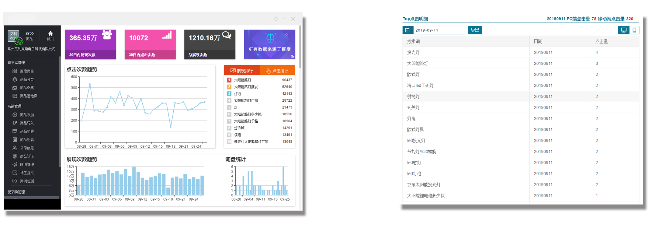 截止2019年9月9日,只百度愛采購平臺的曝光量已經(jīng)累計1044.84萬,日點擊次數(shù)已經(jīng)上百,詢盤量持續(xù)穩(wěn)定。