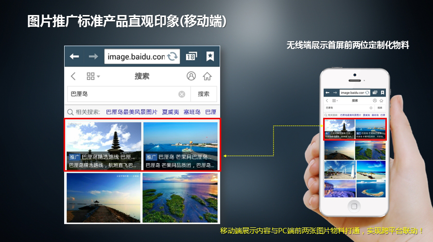 百度圖片推廣是一種針對特定關(guān)鍵詞的網(wǎng)絡(luò)推廣方式,按時間段固定付費,出現(xiàn)在百度圖片搜索結(jié)果*頁的結(jié)果區(qū)域,不同詞匯價格不同。企業(yè)購買了圖片推廣關(guān)鍵詞后,就會被主動查找這些關(guān)鍵詞的用戶找到并向其展示企業(yè)推廣圖片,給企業(yè)帶來商業(yè)機會!
